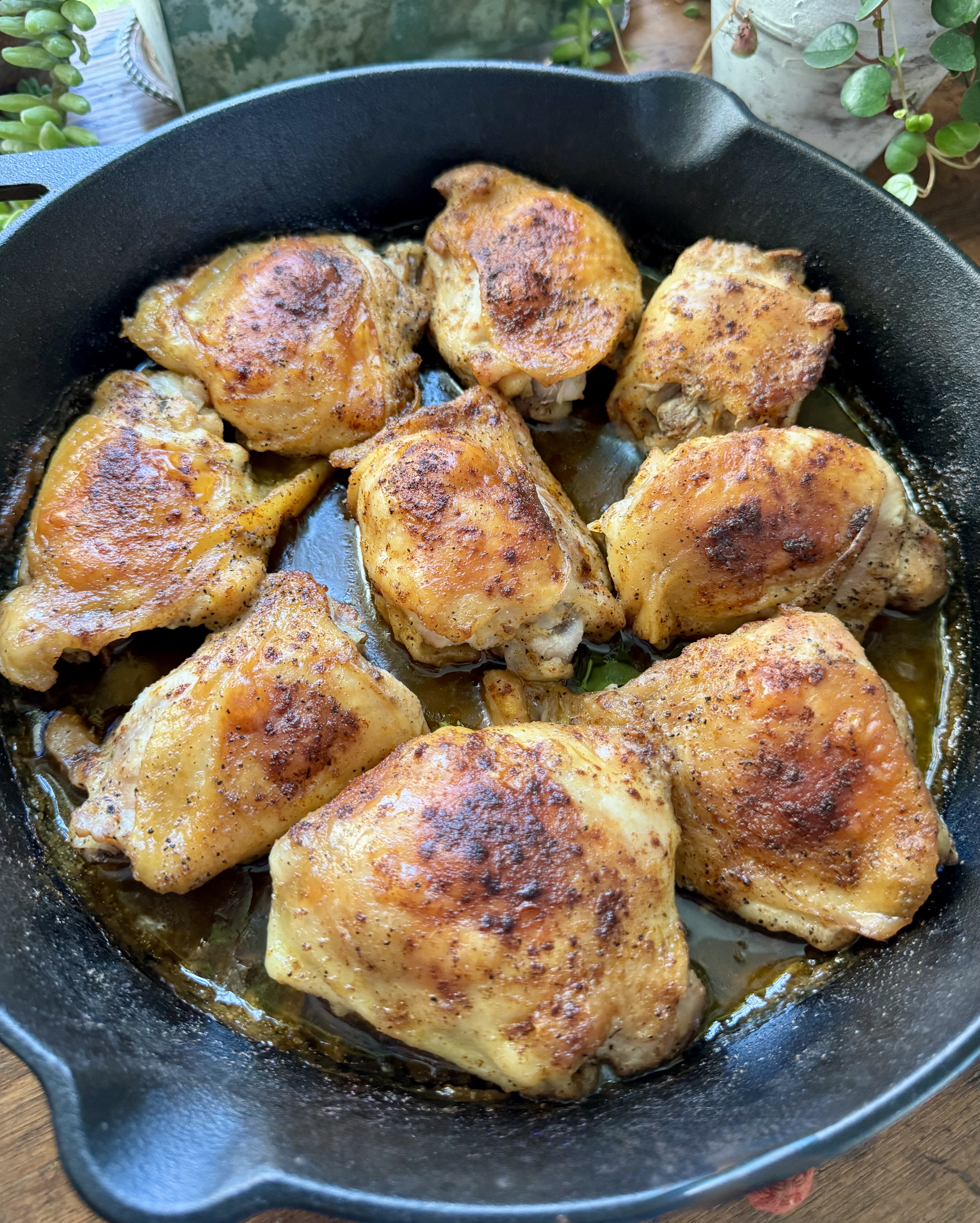 - Place the chicken thighs skin side up in an oiled cast iron skillet.