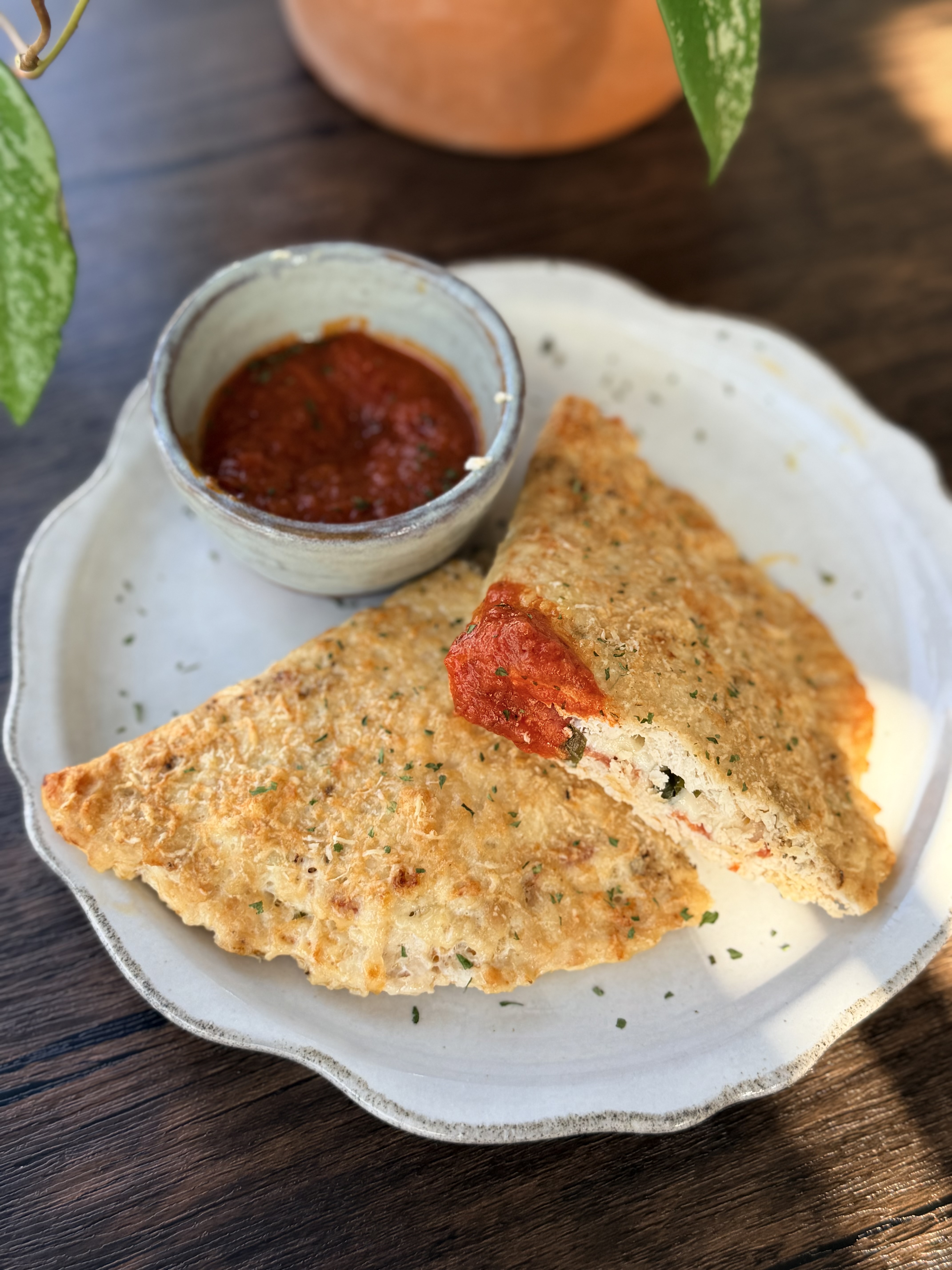 This chicken calzone is basically pizza's protein packed cousin! Chicken + pepperoni + basil + cheese dipped in pizza sauce. Perfection! Low carb, low calorie – delicious!
